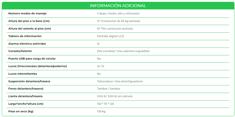 Para seguridad tiene alarma eléctrica contra robos donde se bloque el motor, posee freno de pie, freno de mano con función anti deslizante, sistema de transmisión para alto torque, con llantas de 3.00-8. Además, como muchos de nuestros vehículos viene con luces direccionales para que los demás conductores puedan anticipar tus movimientos al conducir.